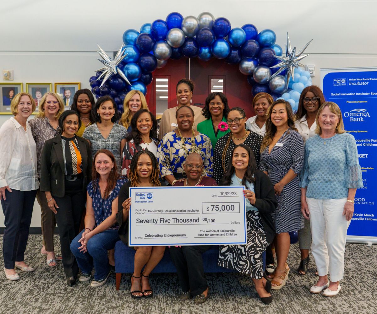 Just a few months back, former Women of Tocqueville chair Cassandra McKinney presented two checks to the United Way Social Innovation Incubator in a second-floor room of the Dallas College Bill J. Priest Institute. The first was $125,000 on behalf of her employer, Comerica Bank, an investor in the program since the beginning. And the second, $75,000 on behalf of the WOT Fund for Women and Children.